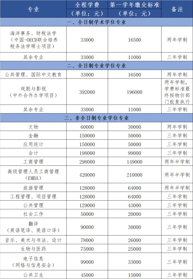 厦门大学2026级硕士研究生学制和学费标准