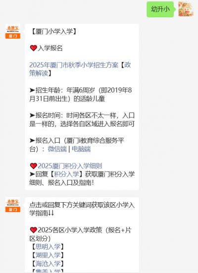 温馨提示:微信搜索关注【厦门本地宝】,回复【小学】或【幼升小】获取2025厦门小学入学(幼升小)招生报名政策、报名时间+入口、学区划片、热点小学/招生政策、积分入学、及其他入学政策等最新消息!